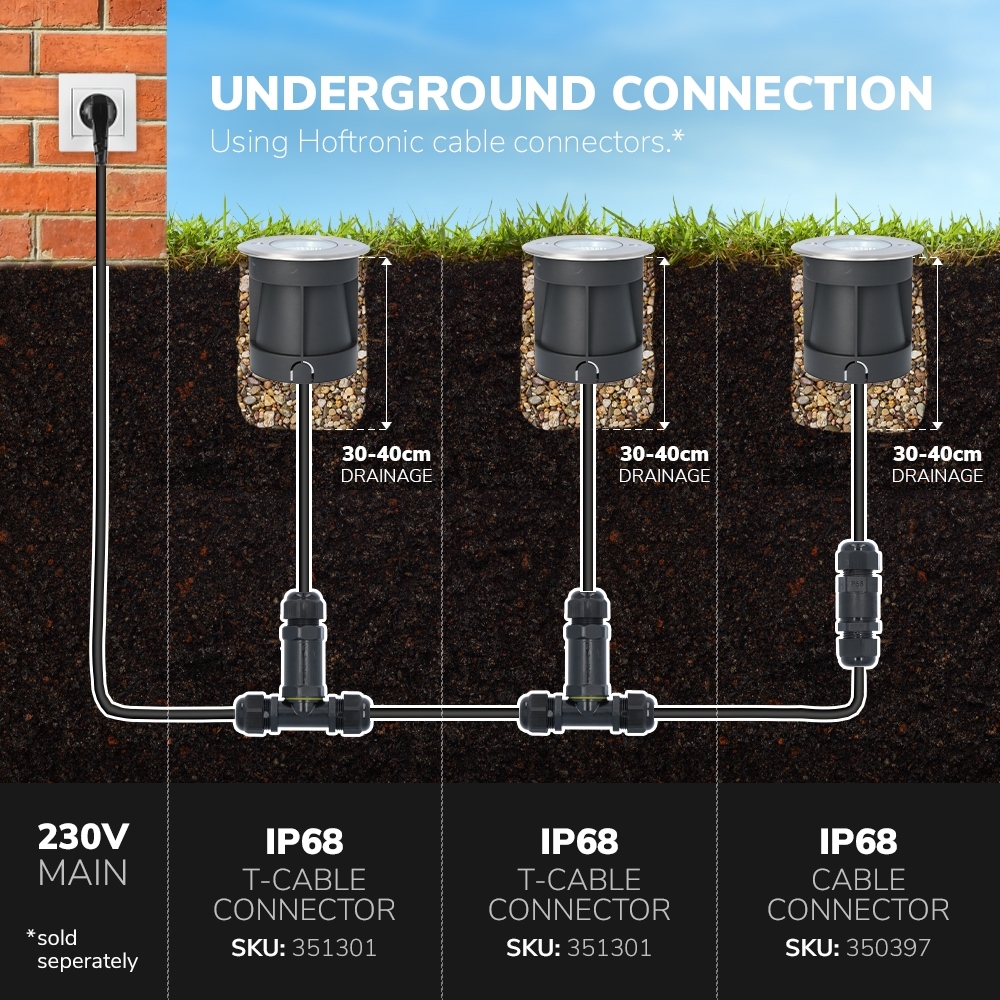 You install the in-ground lights easily by extending the 30cm long installation cable with cable connectors. You can connect the in-ground light directly to the 230 Volt mains.