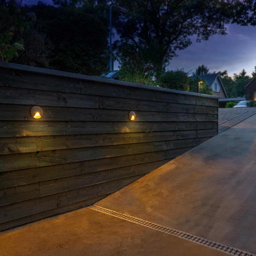 - Éclairage mural d’ambiance sur une clôture ou une façade.