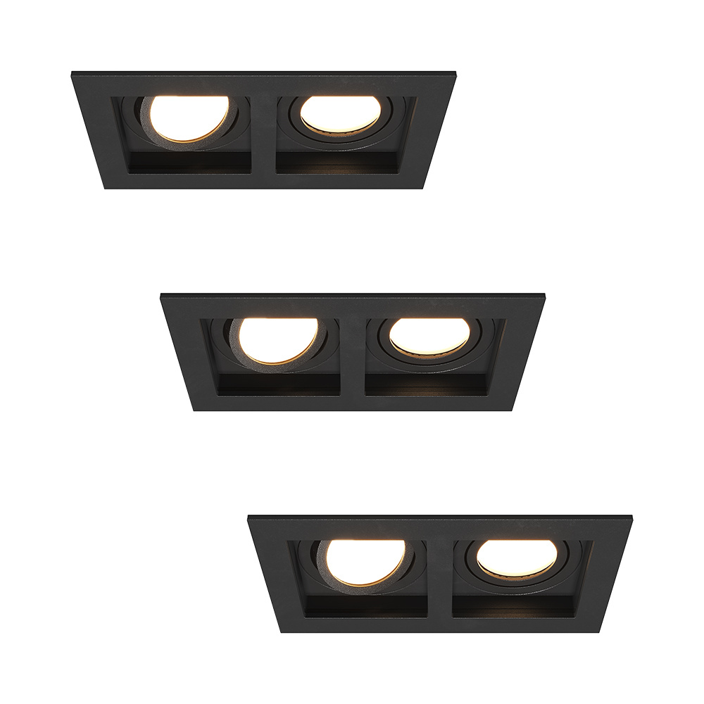 Set van 3 Fresno Dubbele Inbouwspot - Rechthoek - 2x GU10 - 4000K neutraal wit - 8 Watt 690 Lumen - Kantelbaar - IP20 stofdicht - Zwart