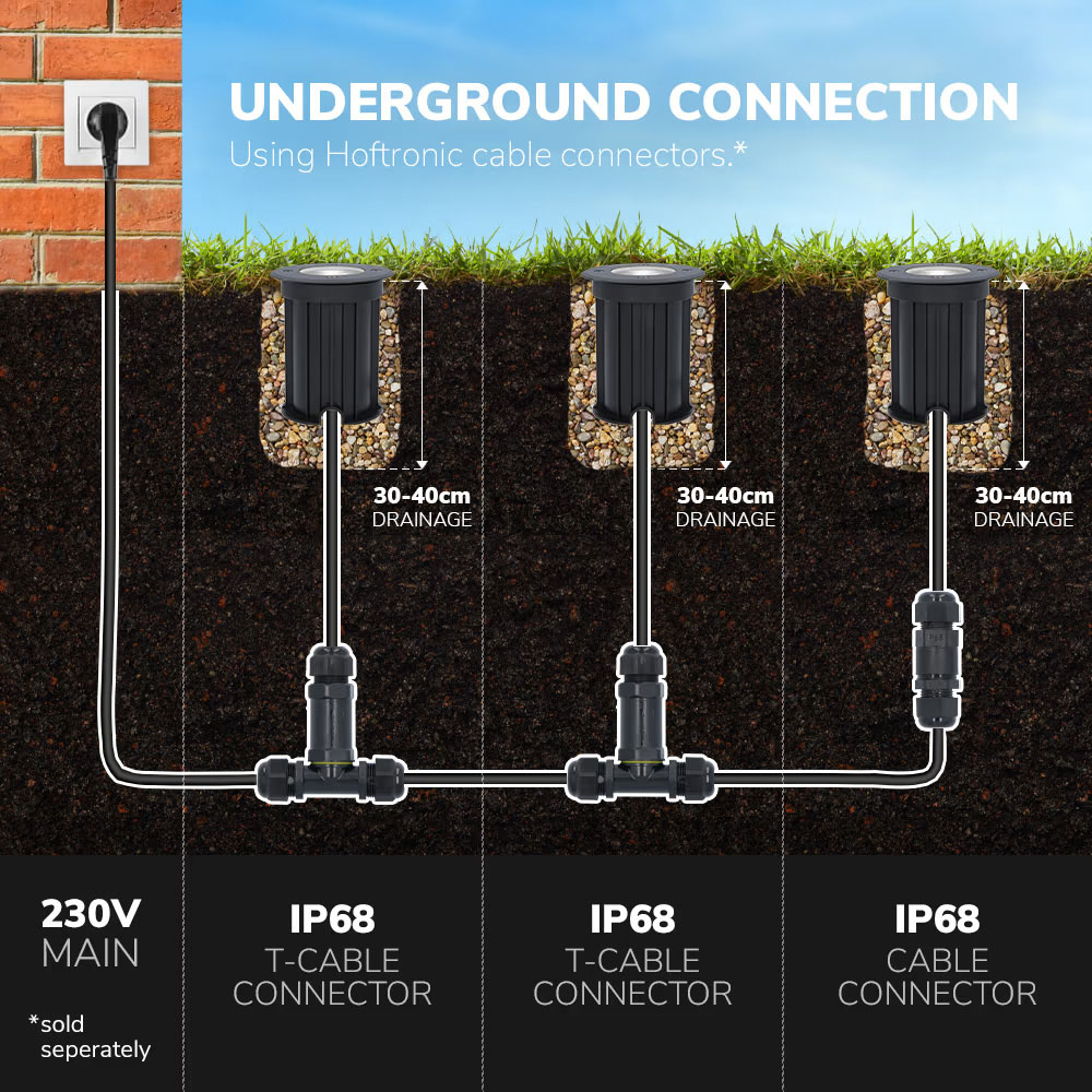 Denk hierbij aan het uitlichten van de gevel, een boom of een struik. De meegeleverde GU10 LED spot is eenvoudig te vervangen zonder dat je de grondspot uit de grond hoeft te halen. Aan de Maisy zit een installatiekabel. Deze kun je eenvoudig verlengen door middel van waterdichte kabelverbinders. Je kunt de Maisy direct op 230 Volt aansluiten. De grondspot is voorzien van veiligheidsglas. Dit maakt de grondspot ook geschikt voor de oprit. Je kunt hierdoor namelijk over de grondspot heenrijden.