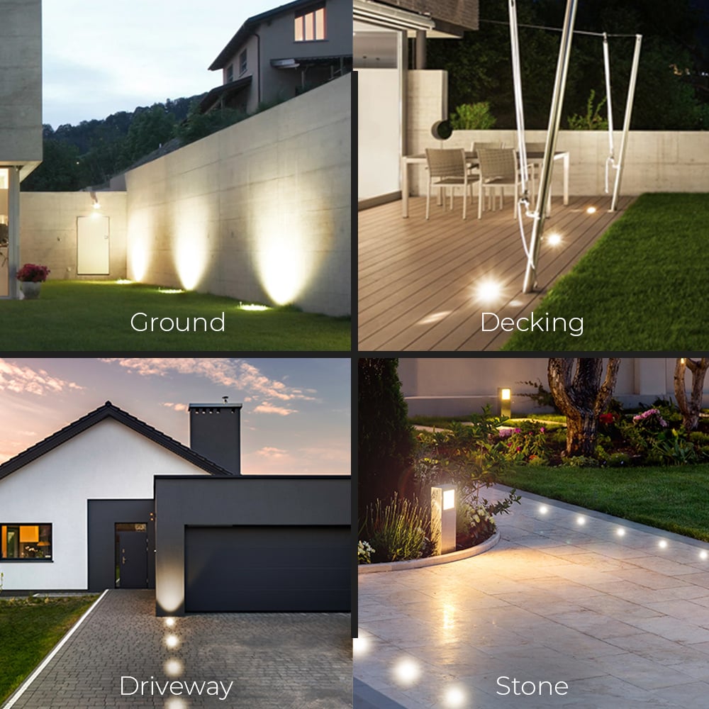 De grondspot kan in elke grondoppervlakte worden gemonteerd, zoals tegels, gras, vlonders of bloemenperken. Dit biedt eindeloze mogelijkheden voor toepassing.
