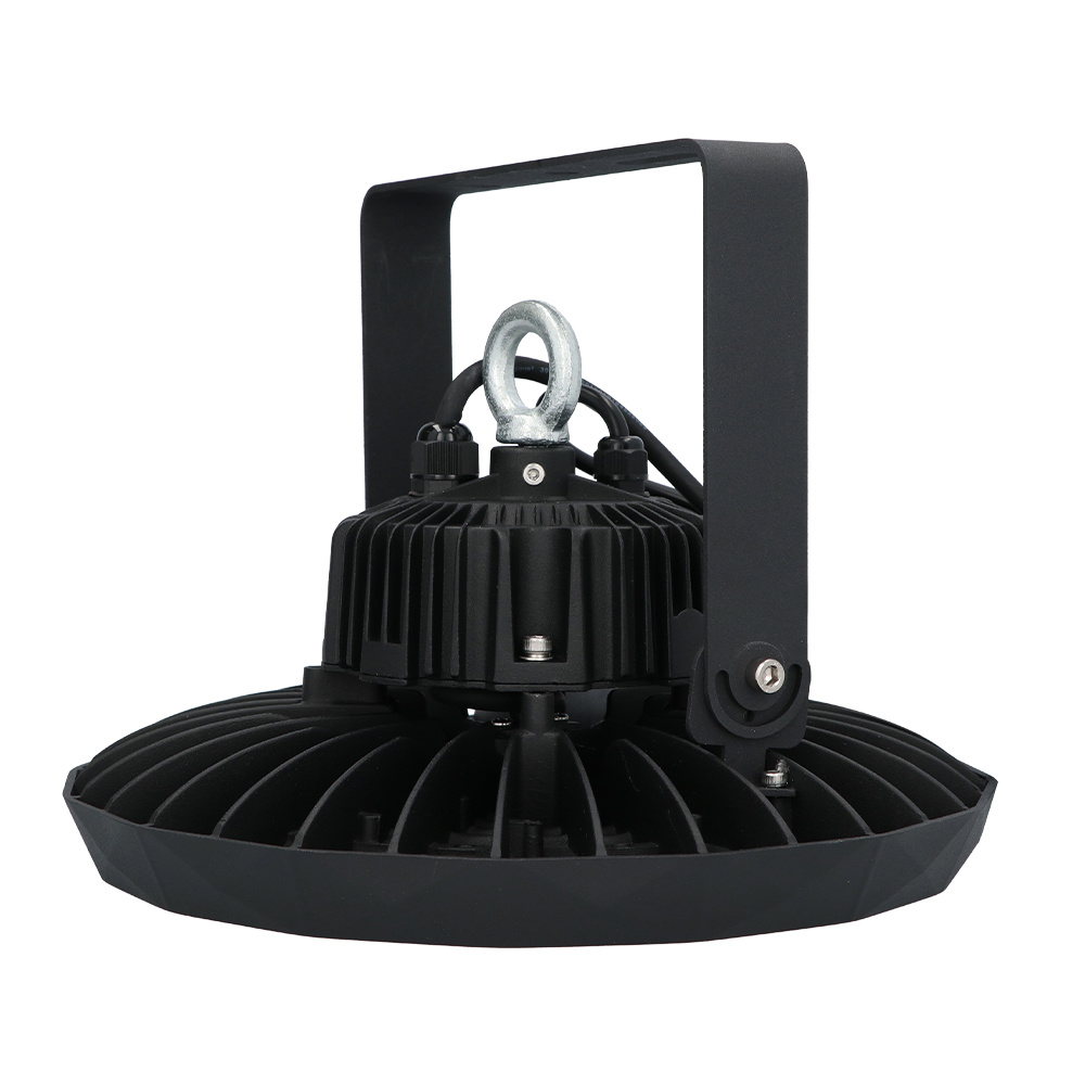 De zwarte, stoere bevestigingsbeugel past goed bij de high bay en valt nauwelijks op, ideaal voor industriële ruimtes met veel zwarte en donkere accenten.