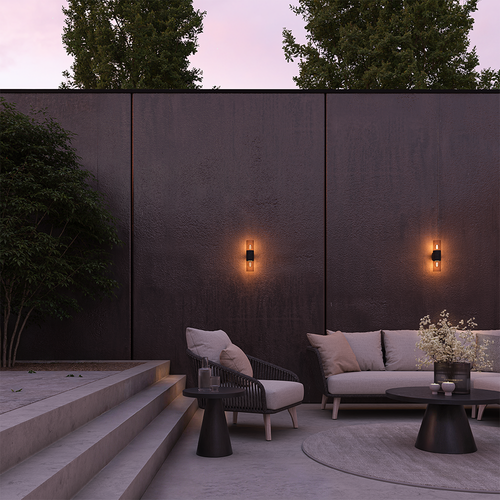 Dankzij de E27 fitting kun je zelf de lichtbron kiezen en de intensiteit van het licht afstemmen op het moment, zodat je altijd precies de ambiance creëert die je zoekt. De geïntegreerde up & down verlichting zorgt bovendien voor een dynamisch lichteffect tegen de wand of gevel.