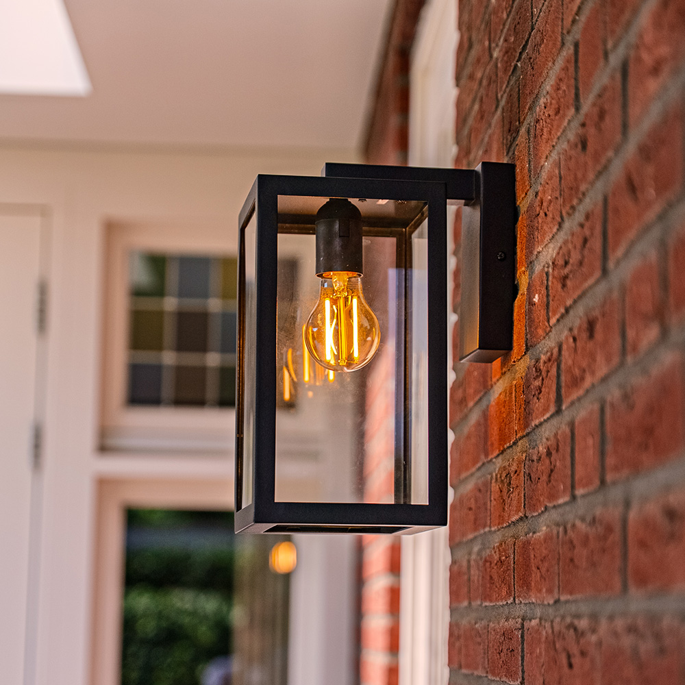 De Brooks is een stijlvolle, klassieke wandlamp in een modern jasje. De Brooks wandlamp is ideaal voor naast de voordeur of aan de achtergevel. Deze zwarte wandlantaarn heeft vier glazen zijkanten met een matzwart gespoten aluminium frame. Door het onderhoudsvrije aluminium en de matzwarte coating is de lamp vocht- en stofwerend en goed te onderhouden. De onderkant van de lantaarn is open, dus je kunt gemakkelijk je E27 lichtbron verwisselen.