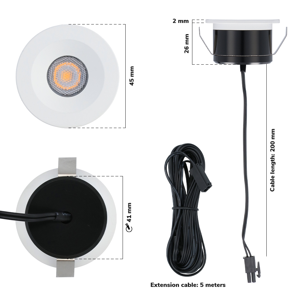 Deze complete set van 12 witte Cadiz LED mini inbouwspots wordt geleverd met een niet-dimbare transformator. Elke spot wordt geleverd met 5 meter kabel. Door de lage inbouwdiepte van slechts 26mm en het moderne design kun je deze inbouwspots bijna overal inbouwen. Wat dacht je van de keuken, woonkamer, carport of veranda? Deze spots zijn gemaakt van onderhoudsvrij aluminium, wat betekent dat ze geen stof en vuil aantrekken en dat ze niet roesten.