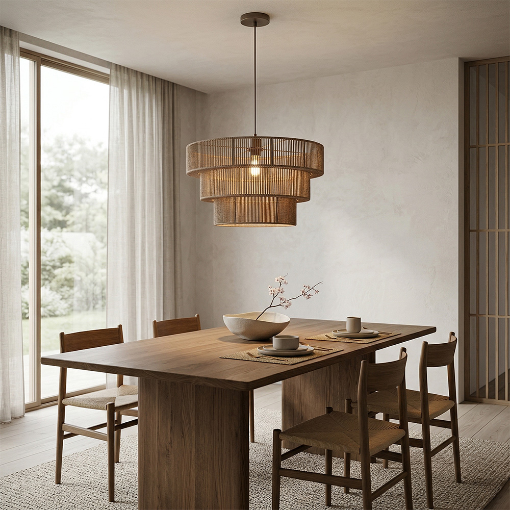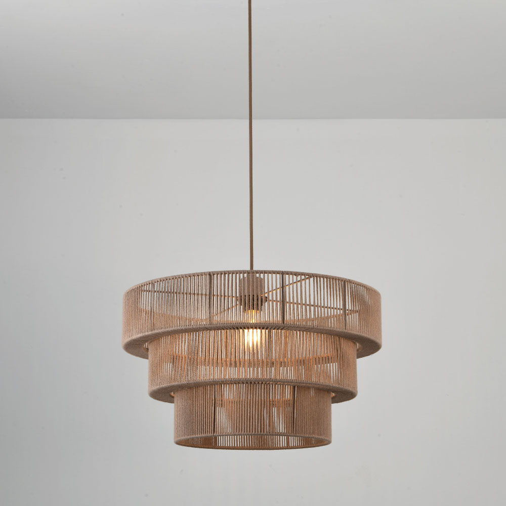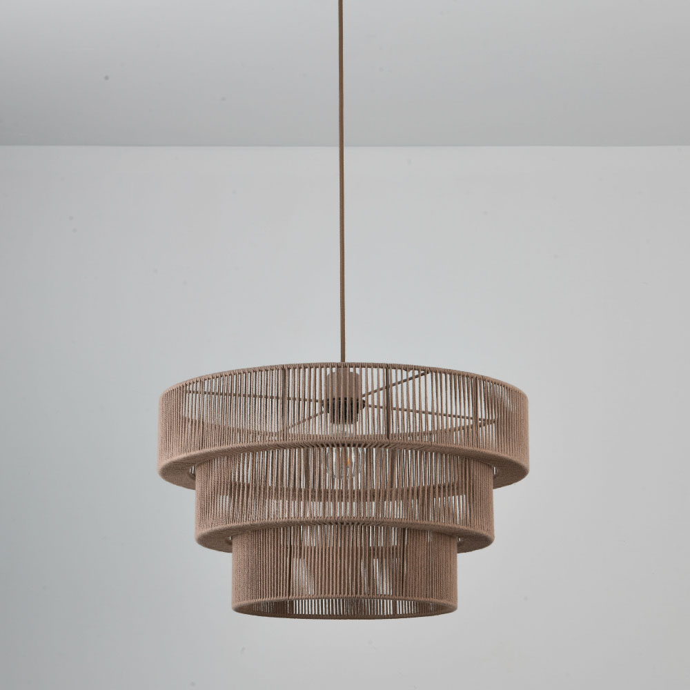Deze drielaagse hanglamp is zorgvuldig opgebouwd van breed naar smal gevlochten koordlagen, waardoor een elegante, natuurlijke pirouette ontstaat die diepte, ritme en verfijning toevoegt aan elke ruimte.