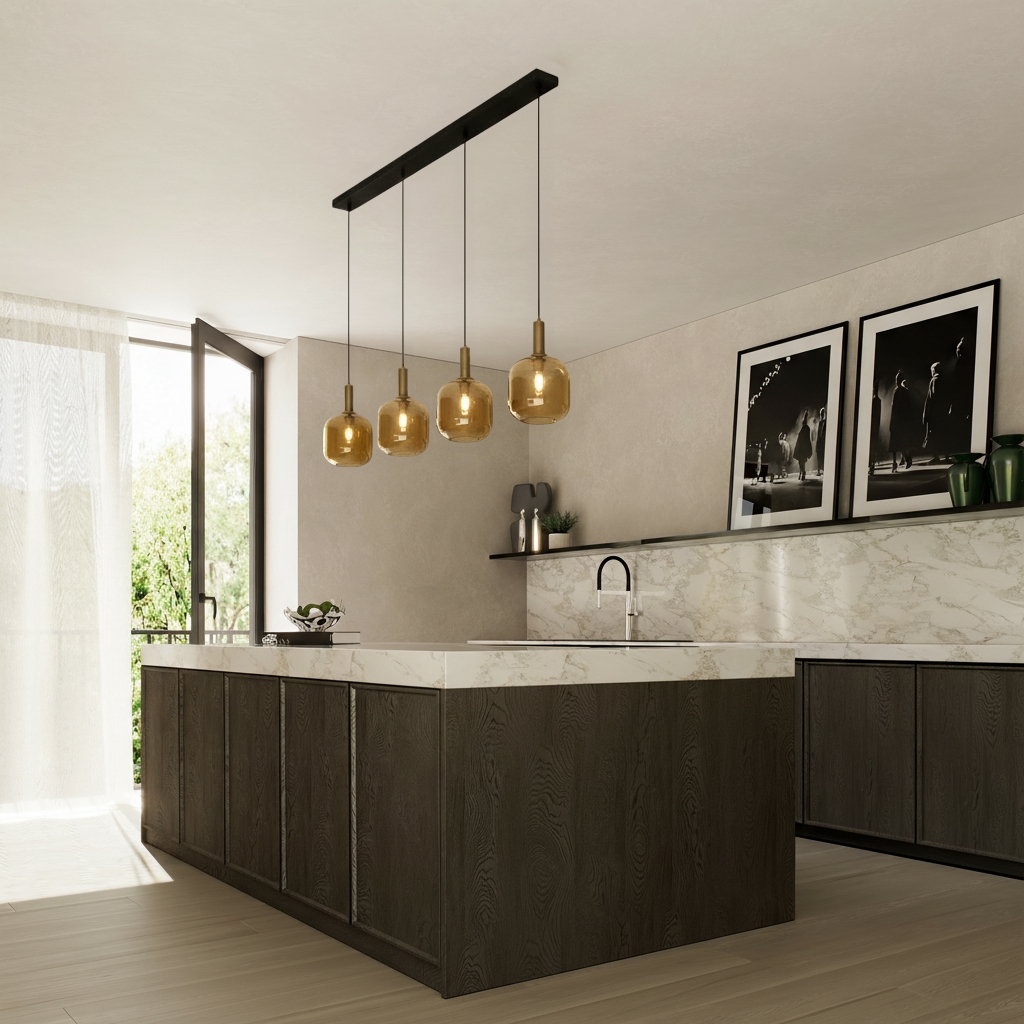 De vier bollen van amberkleurig glas hangen rustig op rij naar beneden en laten het licht zacht neerdalen, zodat het langzaam de kamer in trekt en de ruimte subtiel vult. Daarnaast zorgt het amberglas voor een aardse uitstraling en laat het vormen en stijlen samensmelten. In combinatie met de gouden voetjes die de zwarte kabels met de bollen verbinden, ontstaat er bovendien een verfijnd contrast tussen luxe en stoer.