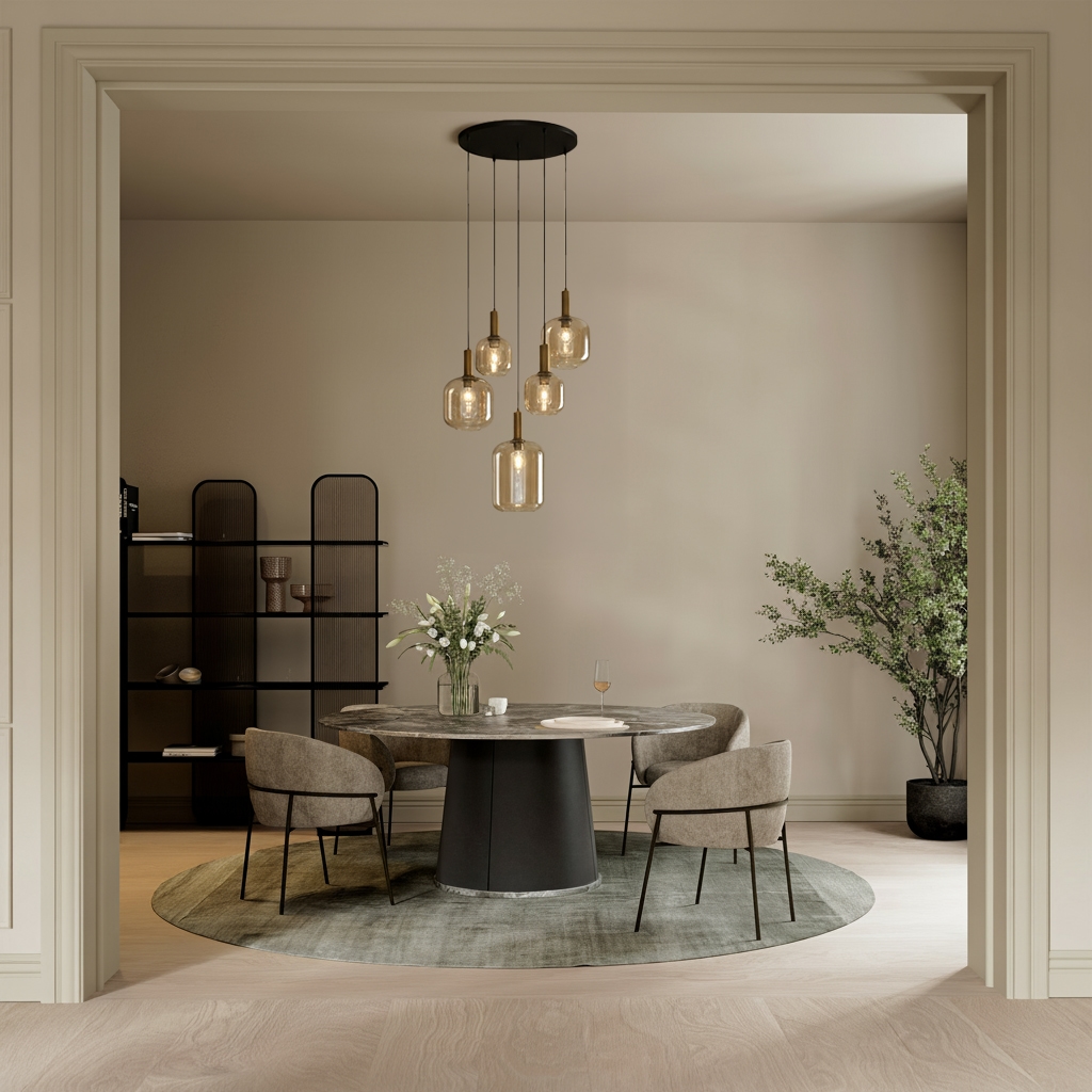 Vijf verfijnd gevormde glazen bollen, sommige langgerekt en andere boller en kleiner, zijn hierbij uitgevoerd in prachtig amberkleurig glas. Ze hangen op verschillende hoogtes en aan verschillende kanten. Elke bol wordt gedragen door een minimalistische zwarte kabel én een cilindervormig gouden voetje dat elegant bovenop het glas aansluit, waardoor een verfijnde mix van rauwe en luxueuze accenten ontstaat, terwijl de ronde zwarte plafondplaat het geheel dan weer een eigentijds en strak fundament biedt.