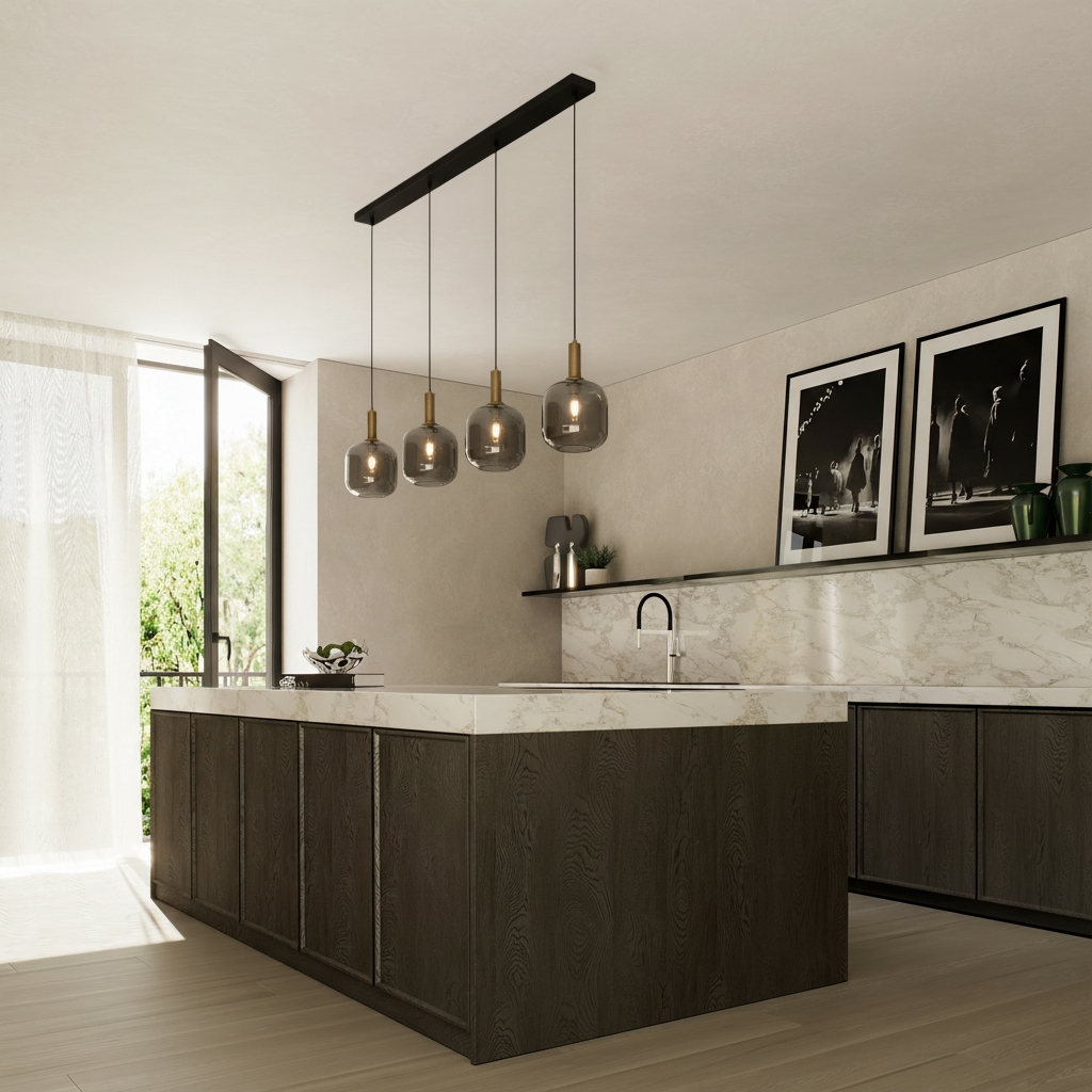 De vier bollen van smoke glas hangen rustig op rij naar beneden en laten het licht zacht neerdalen, zodat het langzaam de kamer in trekt en de ruimte subtiel vult. Daarnaast zorgt het rookglas voor een tijdloze uitstraling en laat het vormen en stijlen samensmelten. In combinatie met de gouden voetjes die de zwarte kabels met de bollen verbinden, ontstaat er bovendien een verfijnd contrast tussen luxe en stoer.