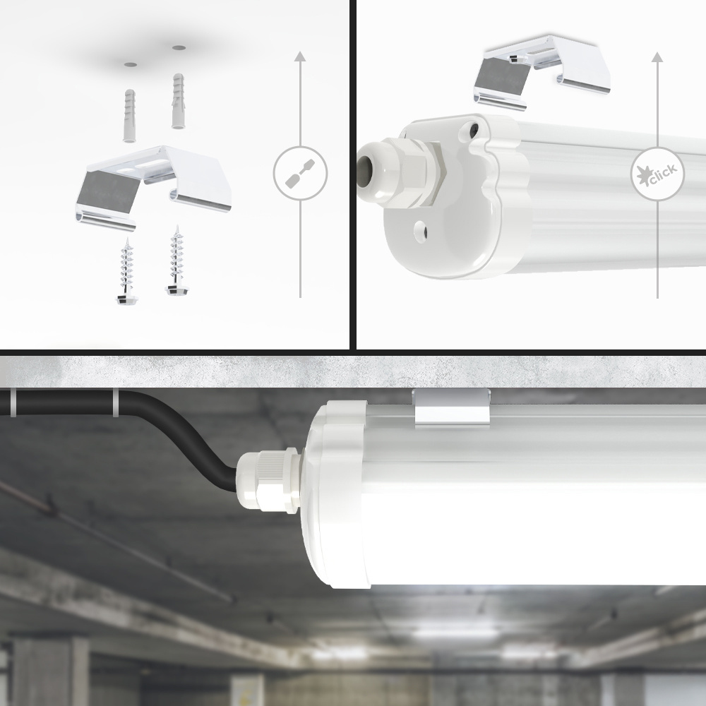 De meegeleverde montageclips maken het monteren van de LED TL lampen zeer eenvoudig, bijvoorbeeld onder een plank, tegen een muur of natuurlijk aan het plafond.