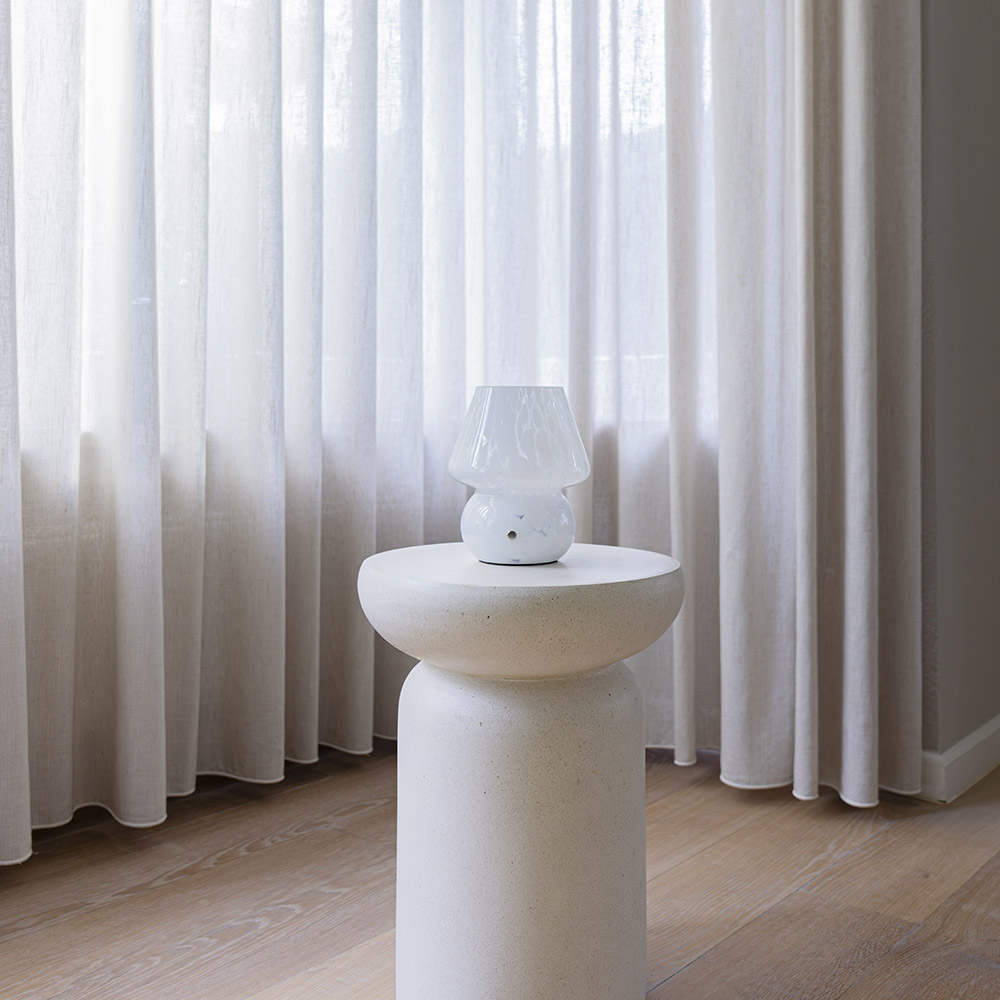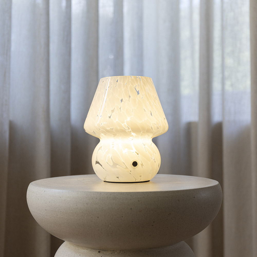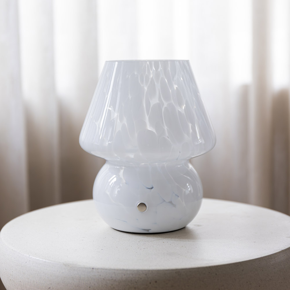 De Qireno marmo tafellamp heeft een klassieke opbouw van een mushroom lamp: een ronde, brede steel met daarop een echte paddenstoelkap die breed begint en smaller oploopt. Alles is uitgevoerd in wit glas, subtiel dooraderd met fijne witte breuklijntjes. Die lijnen geven het glas diepte en maken elke lamp net even anders.