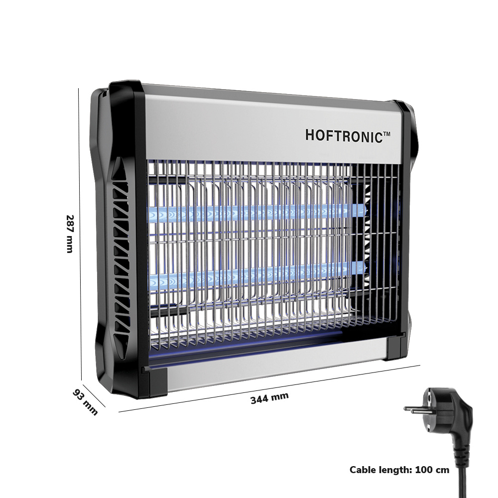 Deze 16 Watt muggenlamp is geschikt voor het insectenvrij houden van ruimtes tot 50 vierkante meter. Deze muggenlamp is voorzien van een extra hoog voltage, waardoor de muggenlamp zelfs effectief is tegen die grote, blauwe bromvliegen. Deze insecten dodende lamp is uitgerust met twee buizen die een UV-licht uitstralen. Vliegen en andere insecten worden door dit licht aangetrokken en vliegen vervolgens de onder spanning staande delen in. Vervolgens vallen ze vanzelf in het opvangbakje.