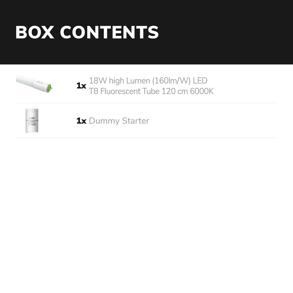 Deze zuinige LED TL buis van 120cm heeft een efficiëntie van 160 lumen per Watt. Hierdoor verbruikt de LED buis slechts 18 Watt en produceert deze 2800 lumen aan licht. De LED buis schijnt een volledig flikkervrij licht en is geschikt voor plaatsing in T8 (G13) LED TL armaturen. De LED buis schijnt een helder daglicht wit licht van 6000 graden kelvin. Deze lichtkleur vervangt de traditionele 860 lichtkleur 1 op 1.