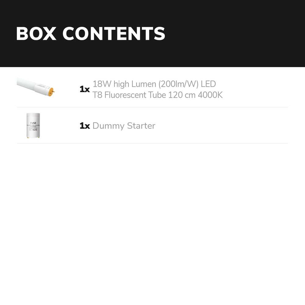 Deze zuinige LED TL buis van 120cm heeft een efficiëntie van 200 lumen per Watt. Hierdoor verbruikt de LED buis slechts 18 Watt en produceert deze 3600 lumen aan licht. De LED buis schijnt een volledig flikkervrij licht en is geschikt voor plaatsing in T8 (G13) LED TL armaturen. De LED buis schijnt een neutraal wit licht van 4000 graden kelvin. Deze lichtkleur vervangt de traditionele 840 lichtkleur 1 op 1.
