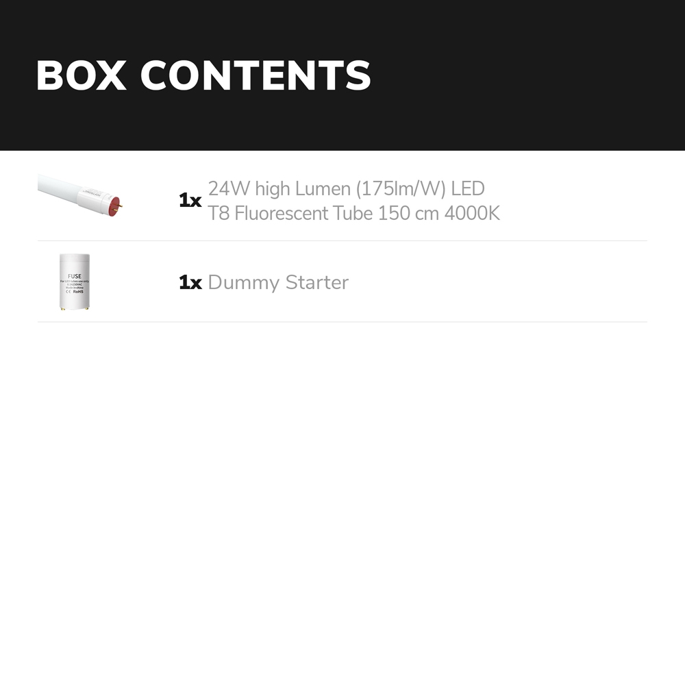 Deze zuinige LED TL buis van 150cm heeft een efficiëntie van 175 lumen per Watt. Hierdoor verbruikt de LED buis slechts 24 Watt en produceert deze 4200 lumen aan licht. De LED buis schijnt een volledig flikkervrij licht en is geschikt voor plaatsing in T8 (G13) LED TL armaturen. De LED buis schijnt een neutraal wit licht van 4000 graden kelvin. Deze lichtkleur vervangt de traditionele 840 lichtkleur 1 op 1.