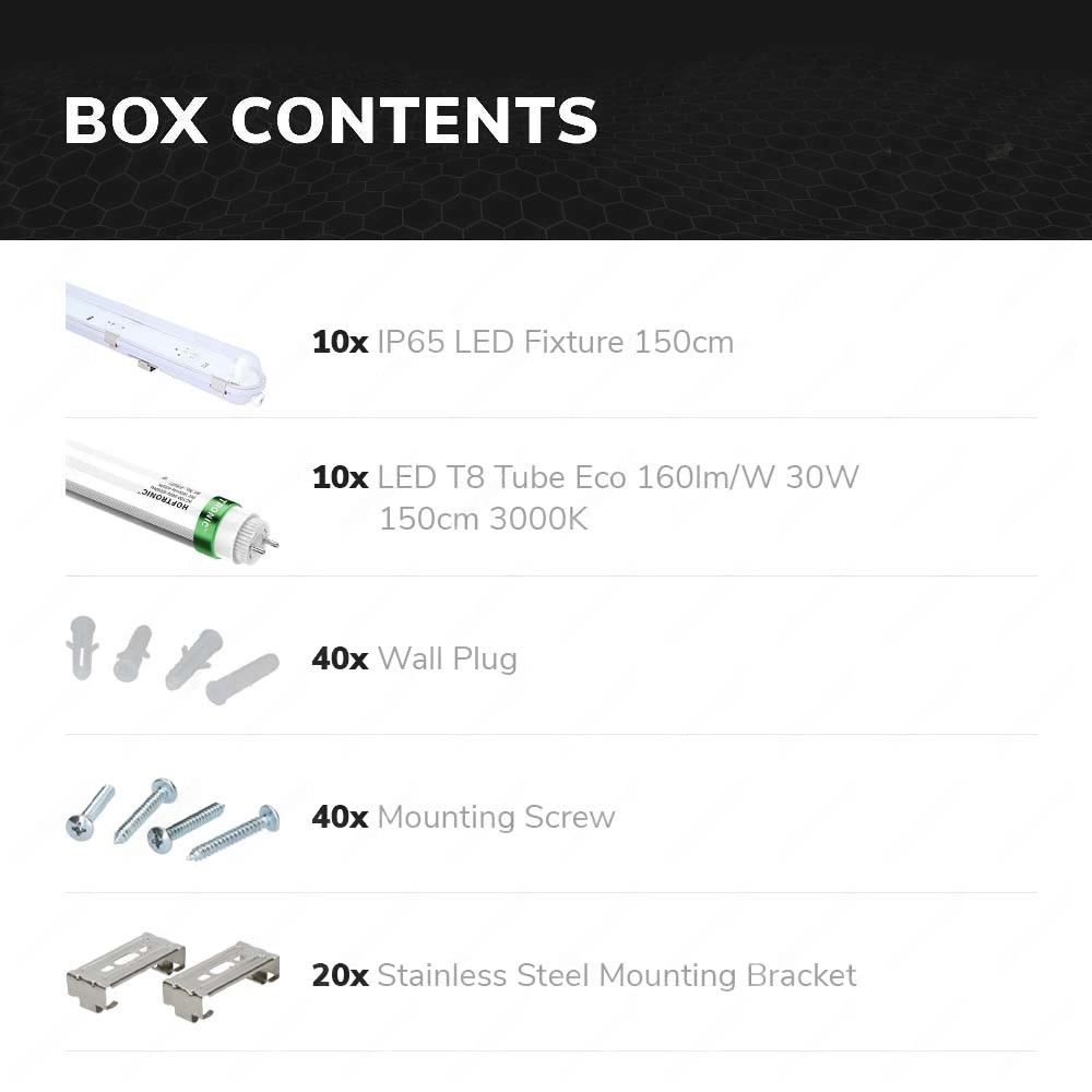 Dieses Vorteilspaket besteht aus 10 LED Leuchtstofflampen mit 150 cm Länge und 10 LED-Röhren. Die LED Leuchtstofflampen sind wasserdicht nach IP65 und daher sowohl für den Innen- als auch für den Außeneinsatz geeignet. Die Leuchten sind aus Polycarbonat und ABS gefertigt. Der Vorteil ist, dass diese Materialien resistent gegen chemische Dämpfe sind. So kannst du die LED-Leuchtstofflampen auch in Fabrikhallen und Autowerkstätten einsetzen.