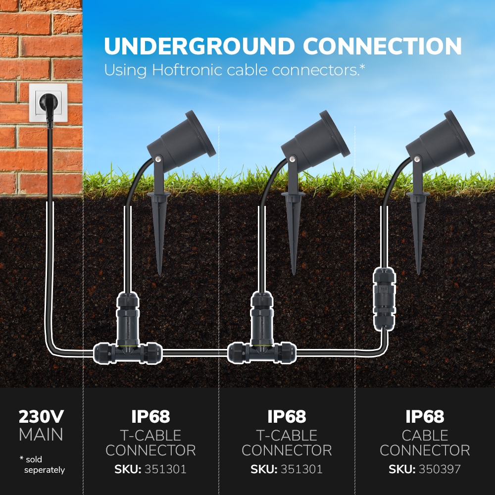 Der Gartenstrahler ist vollständig wasserdicht (IP65) und besteht aus wartungsfreiem Aluminium. Das bedeutet, dass es keine Defekte oder Rost gibt, die durch Feuchtigkeit und/oder Staub verursacht werden. An diesem LED Gartenstrahler ist ein 90 Zentimeter langes, offenes Montagekabel angebracht. Dieses kann mit einem wasserdichten Kabelverbinder leicht verlängert werden.