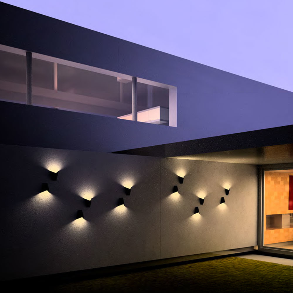 Die Wandleuchte ist mit einer feuchtigkeits- und UV-beständigen schwarzen AKZO-Nobel-Pulverbeschichtung versehen. Damit ist sichergestellt, dass keine Verfärbung durch Sonnenlicht oder Abblättern durch Feuchtigkeit auftritt.