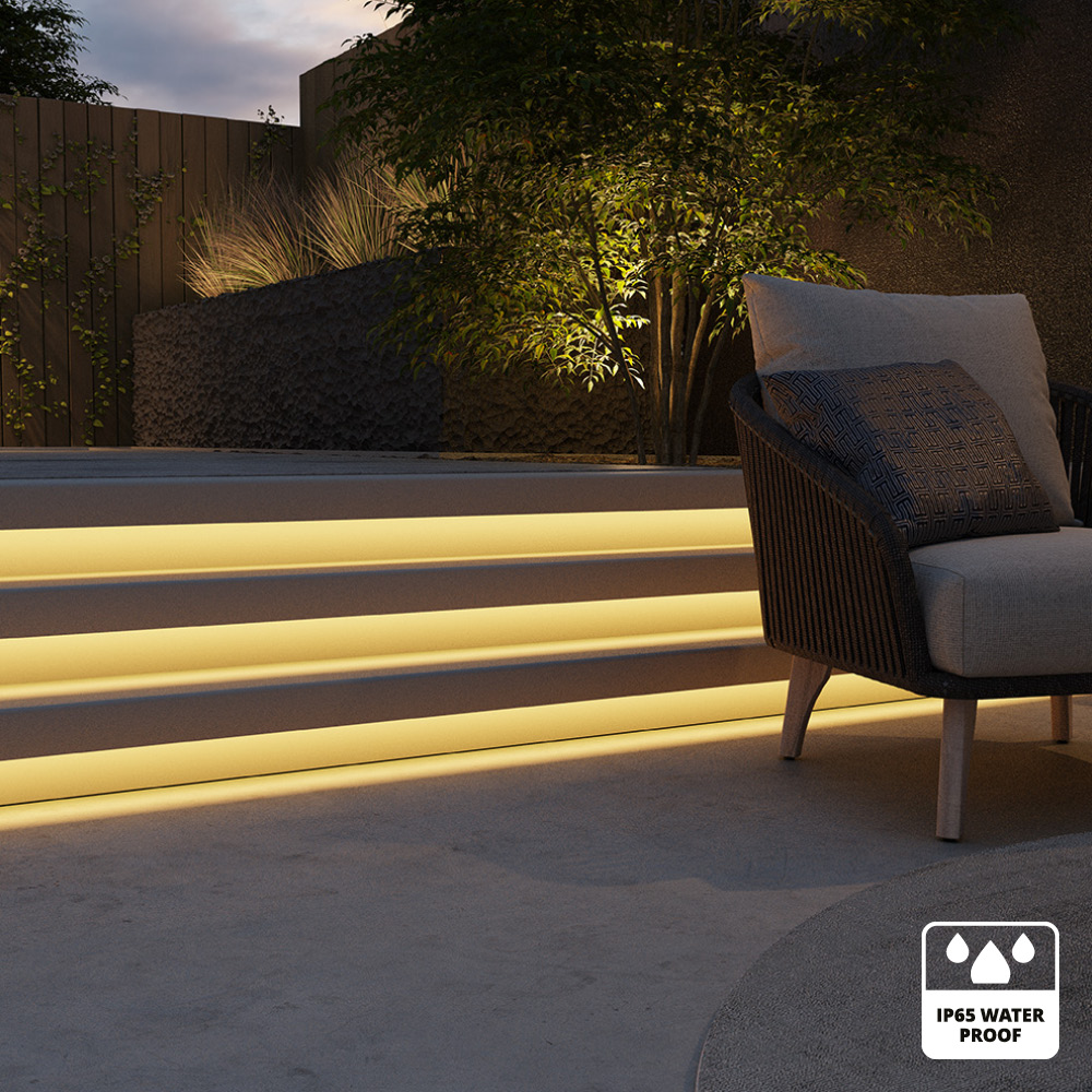 Der LED Streifen strahlt ein warmweißes Licht von 3000 Kelvin aus. Diese warmweiße Lichtfarbe eignet sich sehr gut für die stimmungsvolle Beleuchtung des Gartens, der Terrasse, des Wohnzimmers oder des Schlafzimmers.