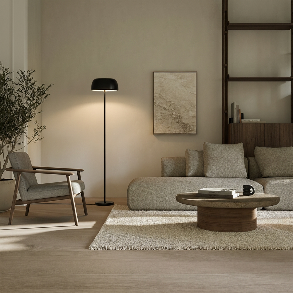 Metallskärmen riktar ljuset nedåt, vilket gör denna golvlampa lämplig som läslampa bredvid en fåtölj eller som mjuk stämningsbelysning i ett hörn av vardagsrummet. Den runda basen förankrar designen ordentligt i golvet, medan den svarta finishen håller helhetsintrycket lugnt och sammanhängande.