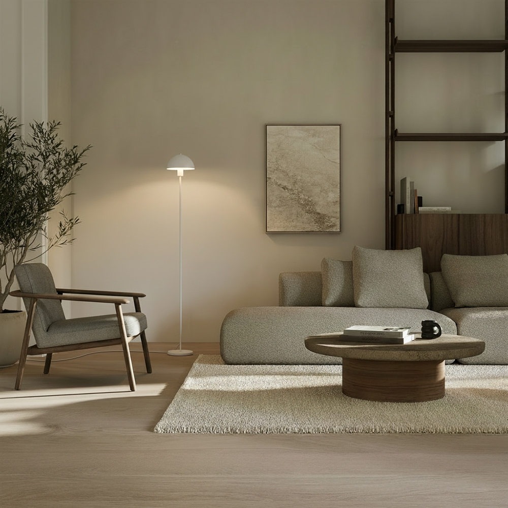 Wistro bianco passar perfekt i skandinaviska, retro eller minimalistiska vardagsrum, där det vita järnet gör rummet ljust och luftigt. Som stående svampformad lampa ger den ett intimt ljus som skapar lugn och stämning bredvid en fåtölj eller ett sideboard i läshörnor, sovrum eller lounger.