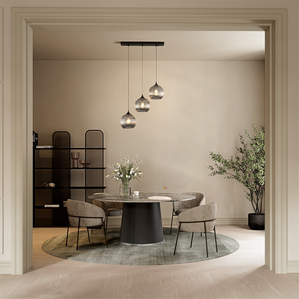 Lampans tre karakteristiska glaskulor hänger nedväxlande, som droppar i ett vattenfall. Kåporna av räfflat rökfärgat glas låter ljuset falla mjukt, så att det långsamt tränger in i rummet och subtilt fyller utrymmet. Dessutom ger samma räfflade linjer ett tidlöst utseende och låter former och stilar smälta samman. I kombination med de svarta accenterna skapas dessutom en raffinerad kontrast mellan industriellt, lyxigt, robust och modernt.