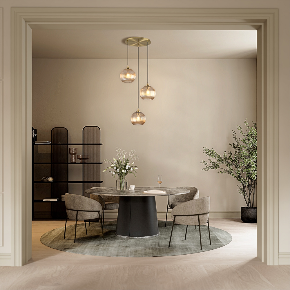 De tre glaskulorna hänger omväxlande och på båda sidor nedåt, som droppar i ett vattenfall. Kåporna av räfflat bärnstensfärgat glas låter ljuset falla mjukt, så att det långsamt tränger in i rummet och subtilt fyller utrymmet. Dessutom ger samma räfflade linjer ett tidlöst utseende och låter former och stilar smälta samman. I kombination med de guldiga accenterna skapas dessutom en raffinerad kontrast mellan jordnära, lyxigt, romantiskt och modernt.