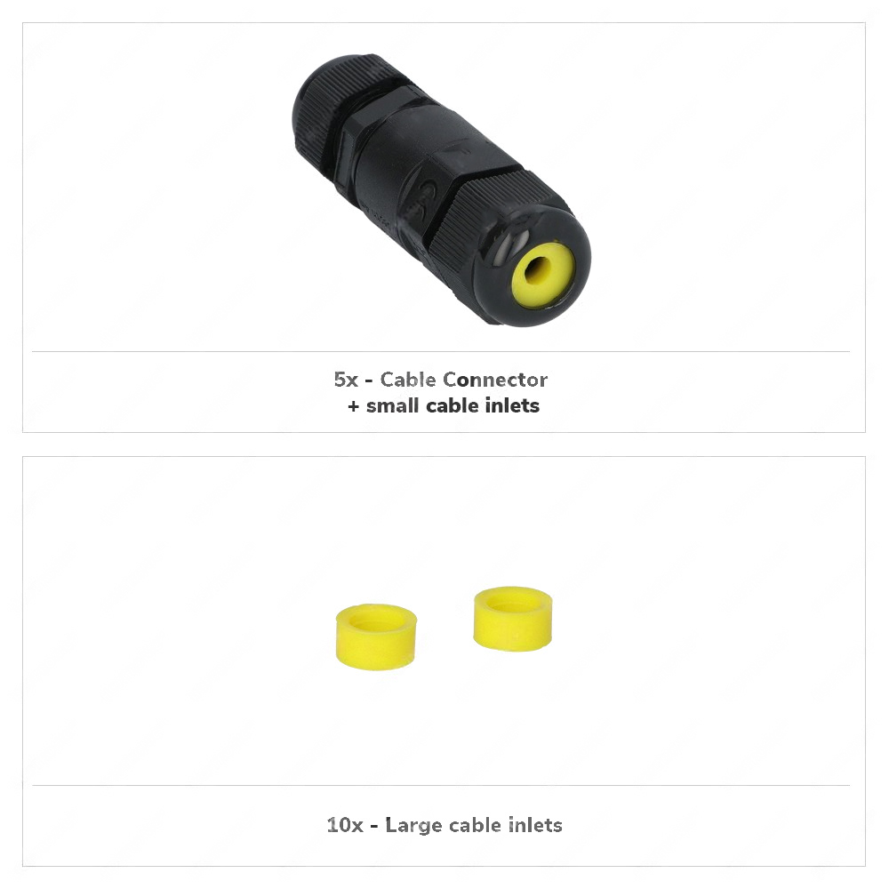 Kabelkontakten levereras med en extra uppsättning kåpor. Detta gör att du kan använda kabelkontakten för olika kabeltjocklekar: 0,5 mm - 2,5 mm (2-ledad) och 4 mm - 12 mm (3-ledad).