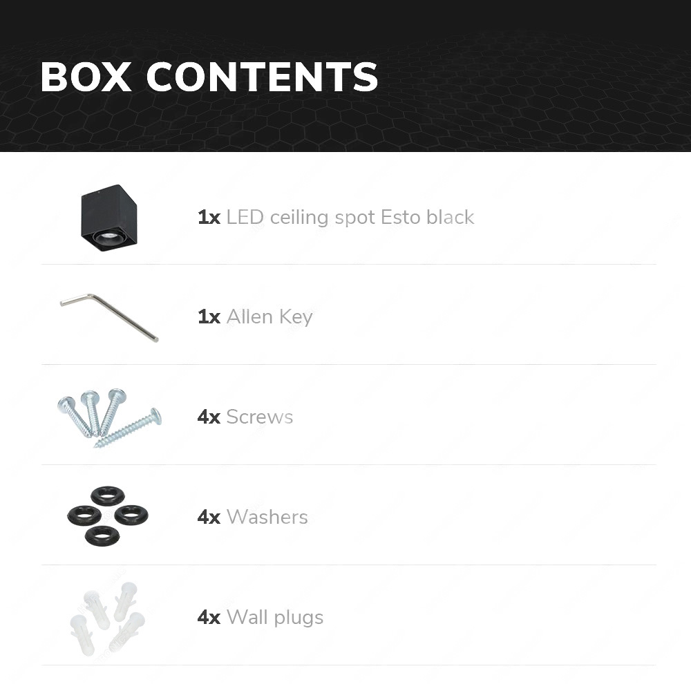The surface-mounted spot has a GU10 fitting and is supplied without a light source. This allows you to easily determine the light color, beam angle and light output of the surface-mounted spot. With the Esto you will receive all the necessary materials to mount the surface-mounted spot.