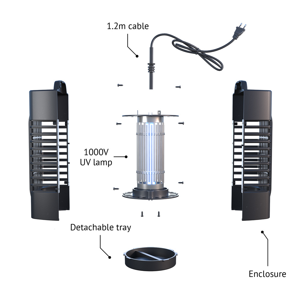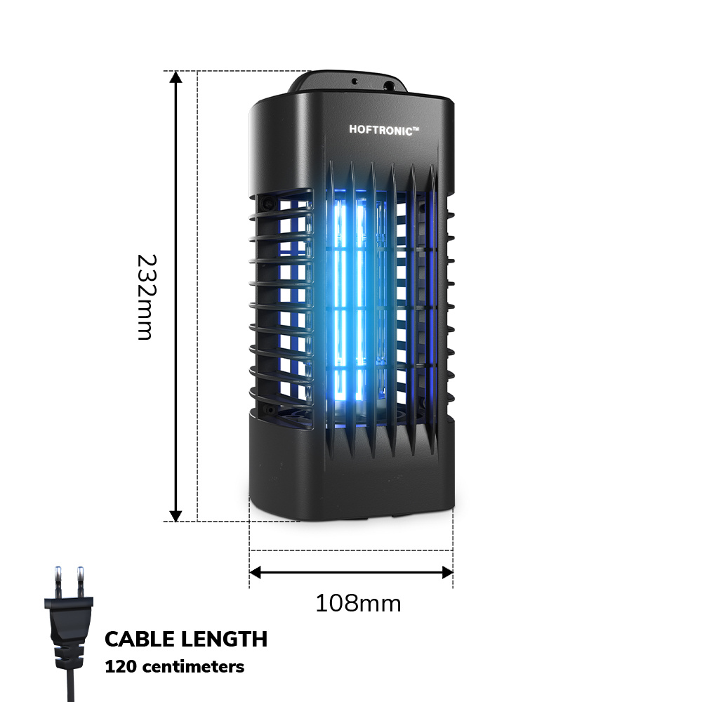 Are you tired of that annoying buzzing too? And are you done with the nightly searches for mosquitoes in your bedroom? Then this bug lamp is for you. The soft, blue ultraviolet (UV) light attracts mosquitoes, flies and moths. When they touch the electrically charged wire mesh that surrounds the light tubes in the lamp, they receive a power surge and drop dead. No more fussing with fly swatters or chemicals. Hang or place the mosquito trap and enjoy a peaceful, mosquito and insect-free time.