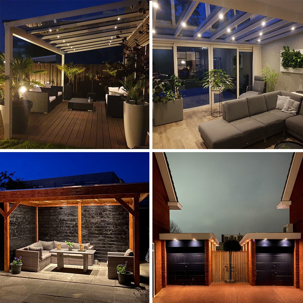 The warm light color of the spotlights creates a pleasant and cozy atmosphere and with an IP rating of IP44, these spotlights can be used both indoors and outdoors and are perfect for your bathroom, kitchen, porch, patio cover or carport. Please note that they are not suitable as in-ground lights!