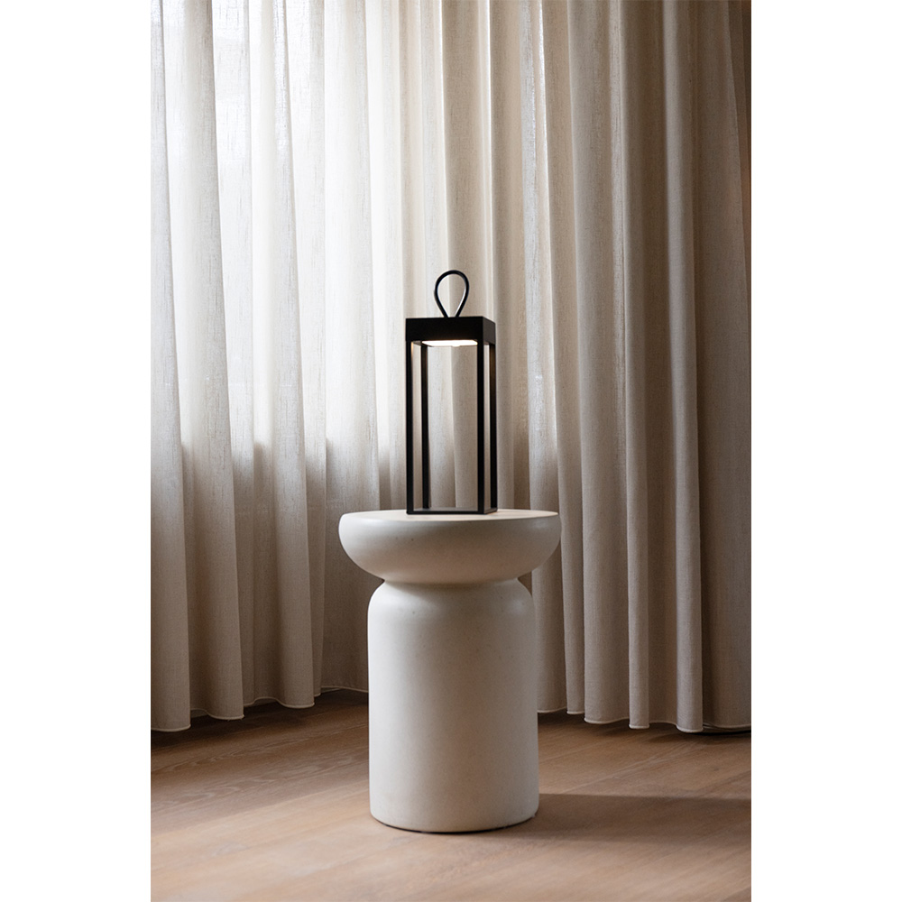 The loop on top is not only a visual feature but also enhances the lamp’s lantern-like character. This makes the Larion reminiscent of old work lights or outdoor lamps, but translated into a modern and refined design. The integrated dimmer allows you to adjust the light intensity to suit the occasion, from functional to intimate.