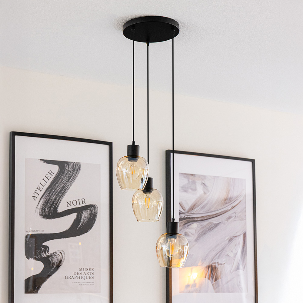 Zora - LED Pendant Lamp Glass - Amber - 3 light points - E27 - Black - IP20 - Pendant lamp glass balls